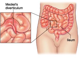 Divertikulum Meckel adalah suatu kelainan bawaan yang merupakan suatu kantung (divertikula) yang menjulur/menonjol dari dinding usus halus, divertikula bisa mengandung jaringan seperti yang terdapat pada lambung, pankreas, atau keduanya.