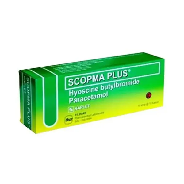 Scopma Plus merupakan obat dengan kandungan zak aktif Hyoscine-N-butylbromide 10 mg, paracetamol 500 mg dalam bentuk kaplet yang mempunyai efek kerja sebagai mengatasi nyeri spastik pada traktus biliaris, saluran kemih, dan organ genital wanita dan nyeri paraksismal pada penyakit lambung atau usus halus.
