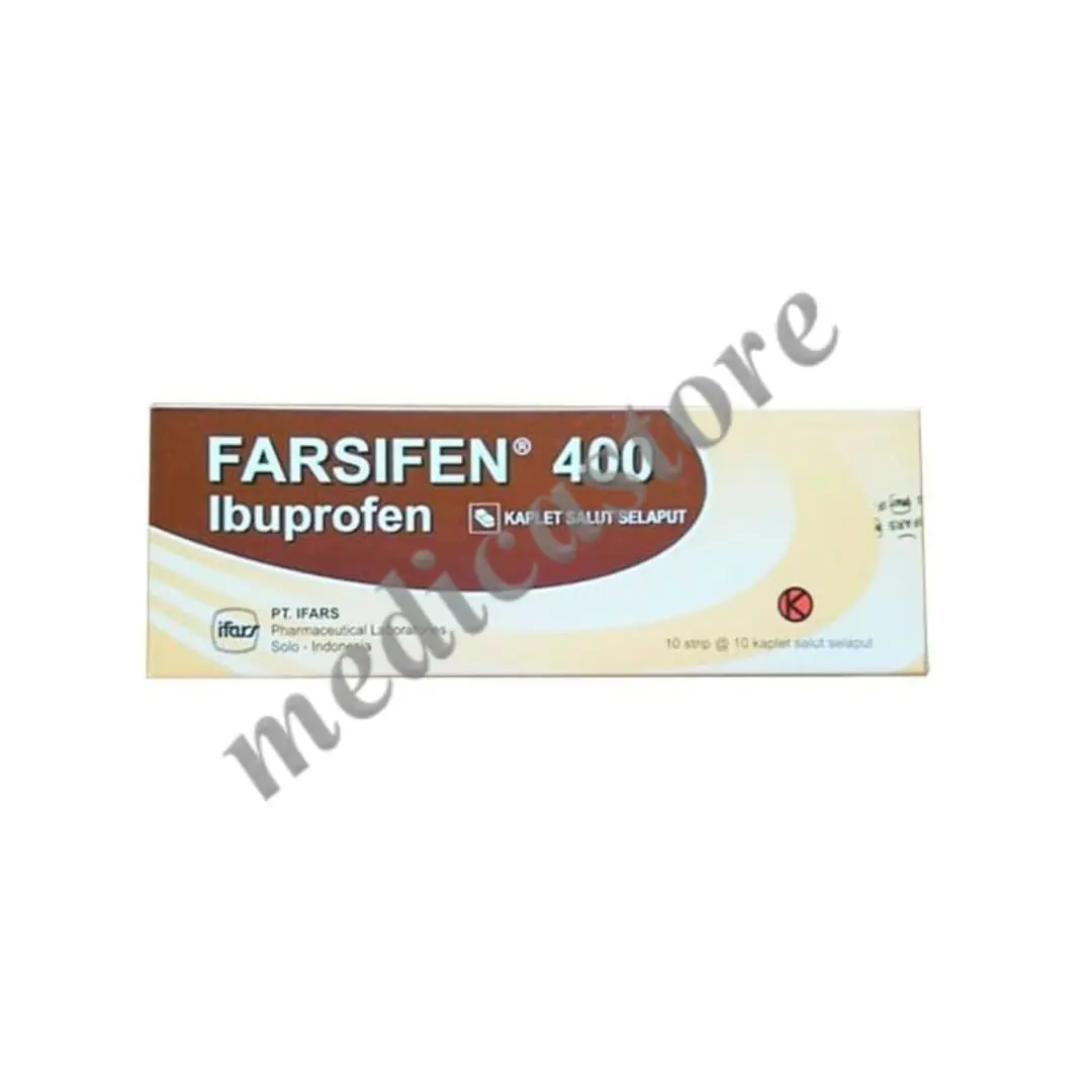 Farsifen merupakan obat dengan kandungan zak aktif Ibuprofen 400mg dalam bentuk kaplet yang mempunyai efek kerja sebagai menurunkan demam pada anak, meredakan nyeri ringan sampai dengan sedang seperti sakit gigi, pasca ekstraksi gigi, nyeri pasca oprasi, sakit kepala, nyeri ringan sampai dengan sedang pada penyakit reumatik pada tulang/sendi; terkilir Efek antiinflamasi dan analgesik: meringankan gejala rematik tulang, sendi, non sendi,trauma otot dan muskuloskeletal. Efek analgesik: meringankan nyeri pada dismenore primer, sakit kepala, pencabutan gigi.