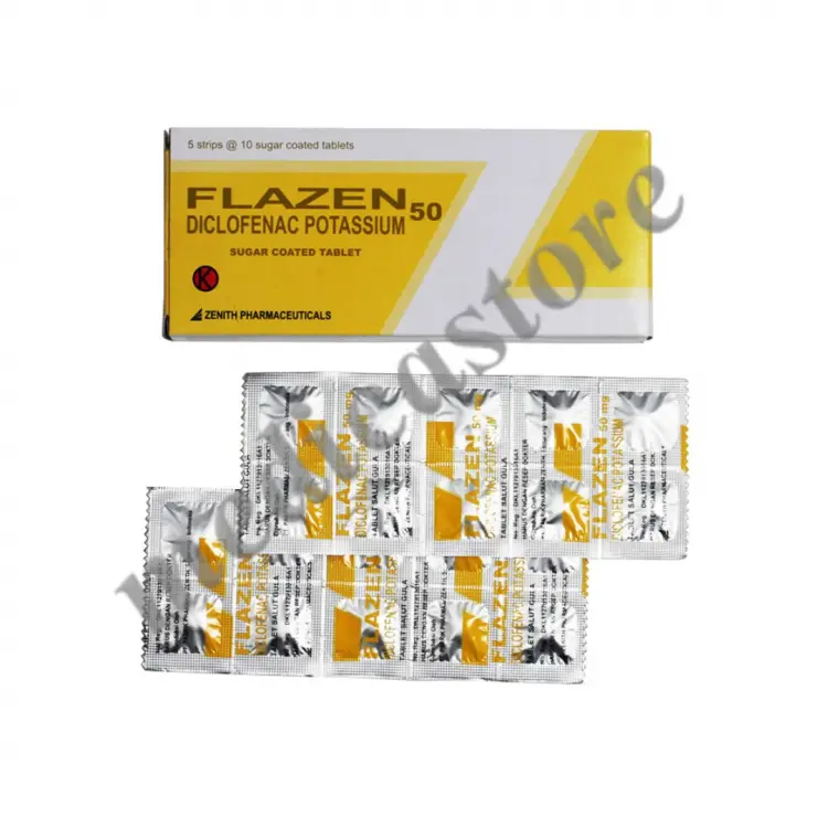 Flazen merupakan obat dengan kandungan zat aktif tiap tablet mengandung kalium diklofenak 50 mg dalam bentuk tablet yang mempunyai efek kerja sebagai obat untuk keadaan meradang setelah traumatik (terpukul/terbentur/teriris) yang disertai rasa sakit/nyeri, osteoartritis, dismenore, peradangan dan nyeri sesudah operasi, paska operasi gigi, sebagai tambahan pada infeksi THT yang meradang yang disertai nyeri hebat. Sindroma nyeri pada tulang belakang, reumatisme non artikular.
