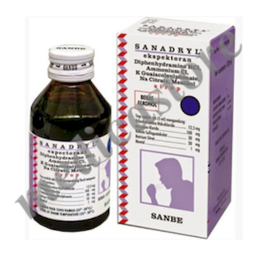 Sanadryl merupakan obat dengan kandungan zat aktif Per 5 ml Diphenhydramine HCl 12.5 mg, Ammon Cl 100 mg, K Guaiacolsulfonate 30 mg, Na Citrate 50 mg, Menthol 1 mg dalam bentuk sirup yang mempunyai efek kerja sebagai mengobati batuk dan penyumbatan pada saluran nafas & tenggorokan.