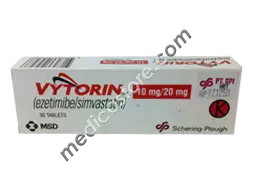 Vytorin merupakan obat dengan kandungan zak aktif ezetimibe 10 mg & simvastatin 20 mg dalam bentuk tablet yang mempunyai efek kerja sebagai terapi tambahan terhadap diet untuk menurunkan kadar kolesterol total, kadar LDL, Apo B, trigliserida dan kdar non HDL dan untuk meningkatkan kadar HDL pada hiperkolesterolemia primer (heterozigot familial & non familial) dan hiperlipidemia gabungan.