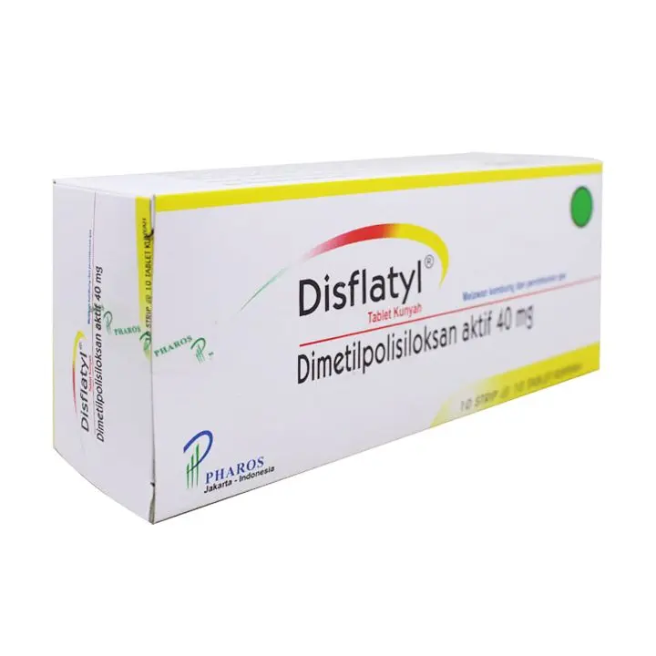 Disflatyl merupakan obat dengan kandungan zak aktif Dimetilpolisiloksan / Dimethylpolysiloxane 40 mg dalam bentuk tablet kunyah yang mempunyai efek kerja sebagai mengobati penumpukan gas pada saluran cerna, terasa seperti ada tekanan & rasa penuh pada uluhati, kembung untuk sementara waktu, kembung setelah operasi, sindroma gastrokardiak, persiapan untuk pemeriksaan dengan sinar-x (rongen) dan gastroskopi.